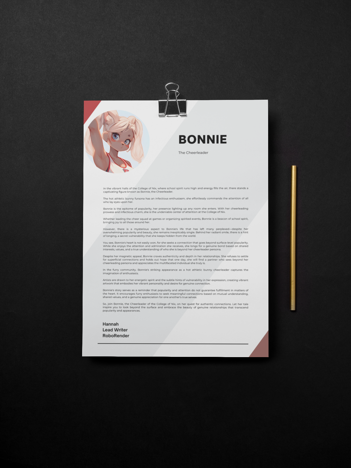 In the vibrant halls of the College of Nix, where school spirit runs high and energy fills the air, there stands a captivating figure known as Bonnie, the Cheerleader. This hot athletic bunny fursona has an infectious enthusiasm and effortlessly commands the attention of all who lay eyes upon her.