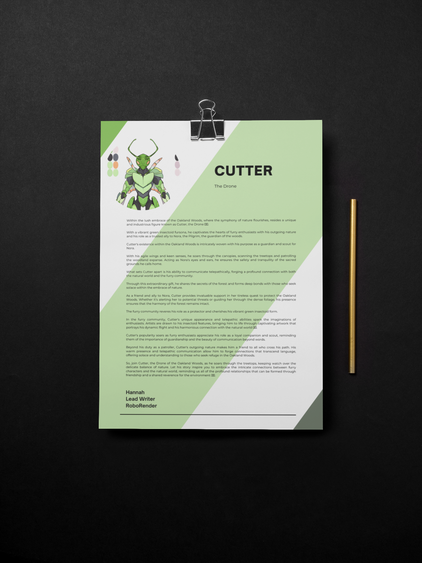 As a friend and ally to Nora, Cutter provides invaluable support in her tireless quest to protect the Oakland Woods. Whether it's alerting her to potential threats or guiding her through the dense foliage, his presence ensures that the harmony of the forest remains intact. The furry community reveres his role as a protector and cherishes his vibrant green insectoid form.