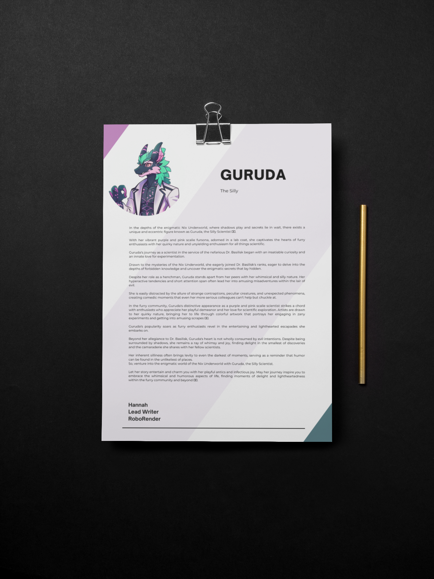 In the depths of the enigmatic Nix Underworld, where shadows play and secrets lie in wait, there exists a unique and eccentric figure known as Guruda, the Silly Scientist. With her vibrant purple and pink scalie fursona, adorned in a lab coat, she captivates the hearts of furry enthusiasts with her quirky nature and unyielding enthusiasm for all things scientific.