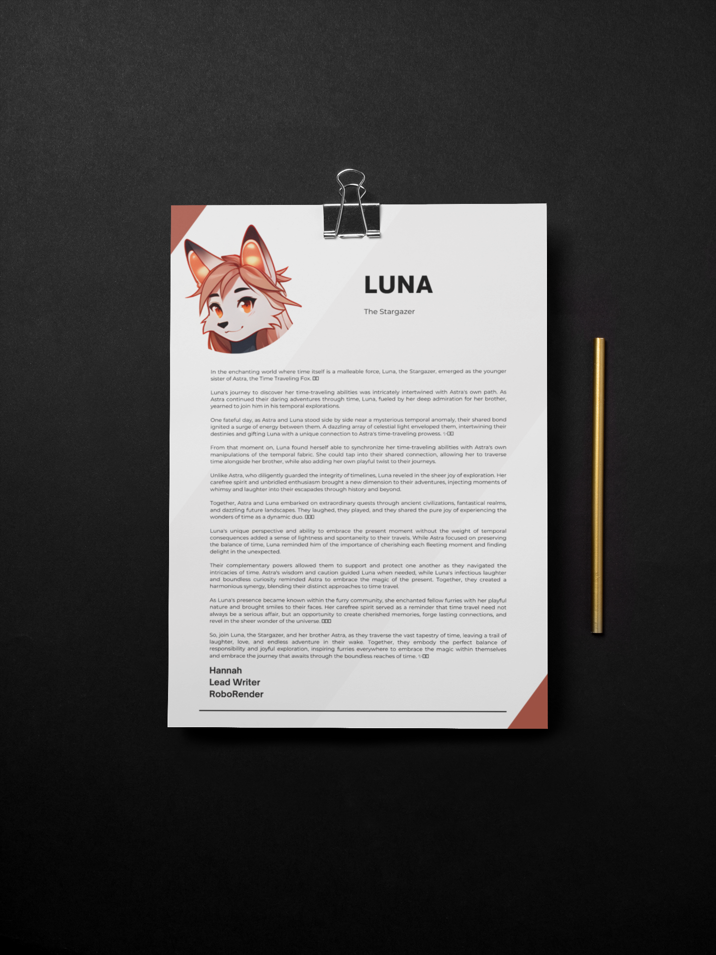 So, join Luna, the Stargazer, and her brother Astra, as they traverse the vast tapestry of time, leaving a trail of laughter, love, and endless adventure in their wake. Together, they embody the perfect balance of responsibility and joyful exploration, inspiring furries everywhere to embrace the magic within themselves and embrace the journey that awaits through the boundless reaches of time.
